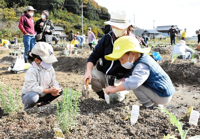 兵庫県加西市若井町にオープンした「にしありた虹の郷ハーブ園」で苗を植える催しが23日開かれた。利用者や地元住民、兵庫大学社会福祉学科の学生ボランティアら約100人が参加し、ミントやタイム、ラベンダーなどの苗を植えた。