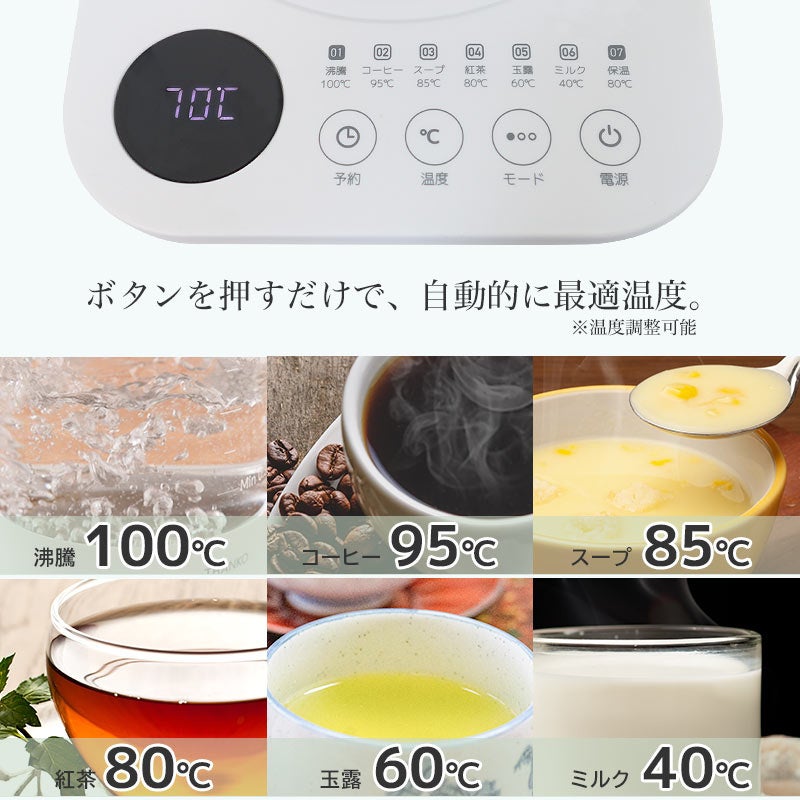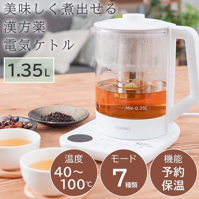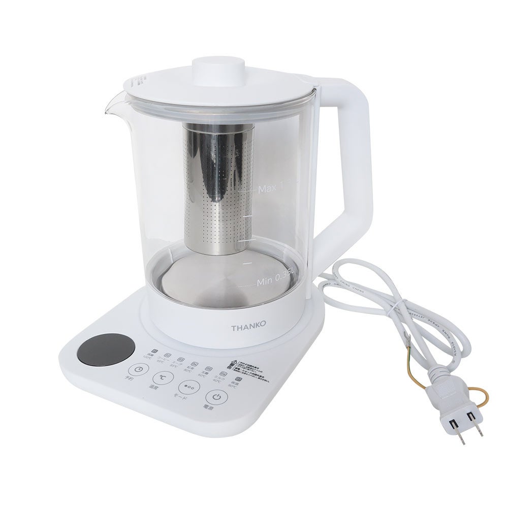 容量1.35L。本体に茶こしがセットできお好みの茶葉を入れてポット内で直接煮出すことが可能。ワンタッチで最適な温度で加熱する7種類のモードを搭載。沸騰100度、コーヒー95度、スープ85度、紅茶80度、玉露60度、ミルク40度、保温80度。加熱後自動で保温モードに切り替わり2時間保温し(沸騰モードを除く)煮出しが可能。モードを選択後お好きな温度にも設定可能(40~100度)。1-24時間後(1時間単位)に設定したモードで動作する予約機能を搭載。ガラス製なので湯量や中の色がすぐに分かります。
