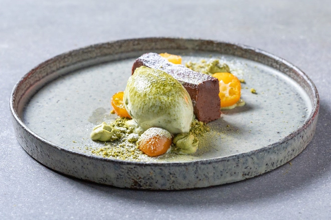 煎茶のジェラート、ドミニカ産チョコレート(カカオ72%)のテリーヌ、地場産金柑のコンポート、春日部産柚子のジュレ、煎茶のパンナコッタに蕗の薹のクランブルをトッピング。自然な甘さの中に柑橘のアクセントがキリリと効いた爽やかな一皿です。
