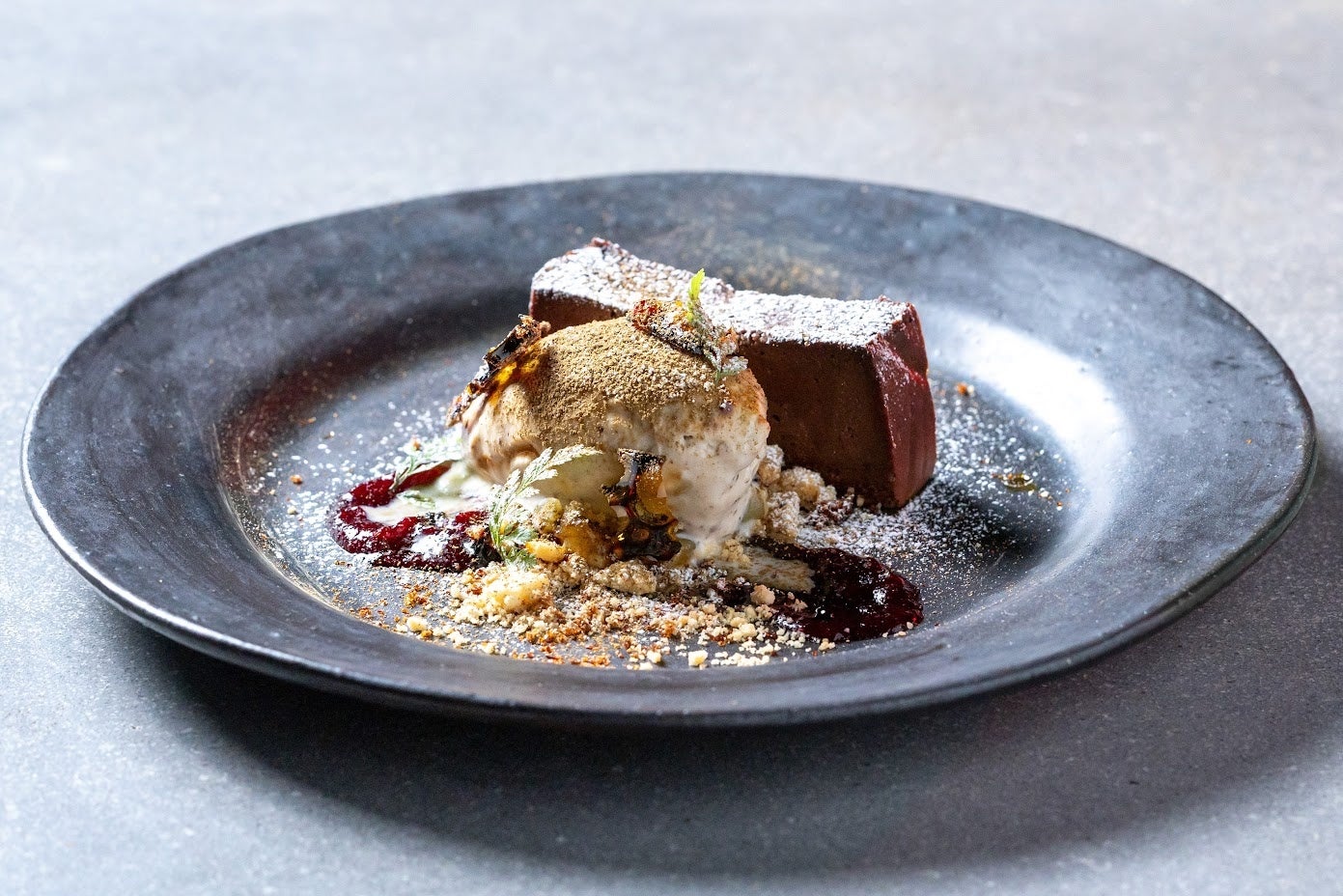 和紅茶のジェラート、インド産チョコレート(カカオ70%)のテリーヌ、和紅茶のパンナコッタに、ローゼルのソース、キャラメルと味噌のパウダーをトッピング。幾重にも重なる香ばしさとさまざまな食感を楽しめる、食べ応え抜群の一皿です。