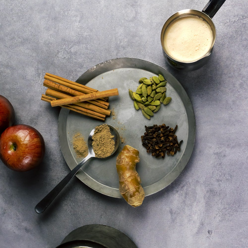 ジンジャー、ブラックペッパー、シナモンなどの体を温めるスパイスをはじめ、甘い香りのカルダモン、クローブ、ナツメグ、等をブレンドしております。